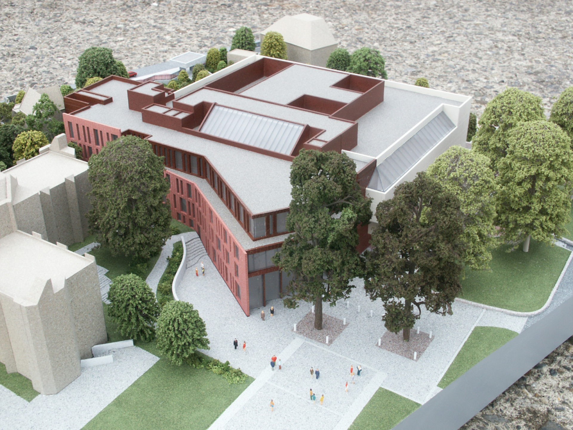 The 6-story, wedge-shaped expansion is located to the east of the existing library and physically connected by a linear “core” containing an atrium, glass floor bridges, and vertical circulation elements. Each floor contains a large reading room overlooking the main quad with smaller scale study and support rooms extending to the south. The expansion presented an opportunity to dramatically increase daylighting to the interior. The architectural language of the addition is comprised of large areas of transparent curtain wall and translucent channel glass that connect to a new elemental, fractured stone wall along the east. The new materials are set in contrast to the existing dense/opaque architecture and establish a much more open and inviting identity for the library.