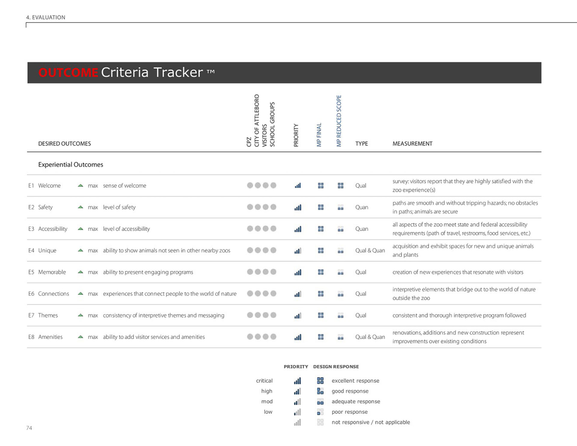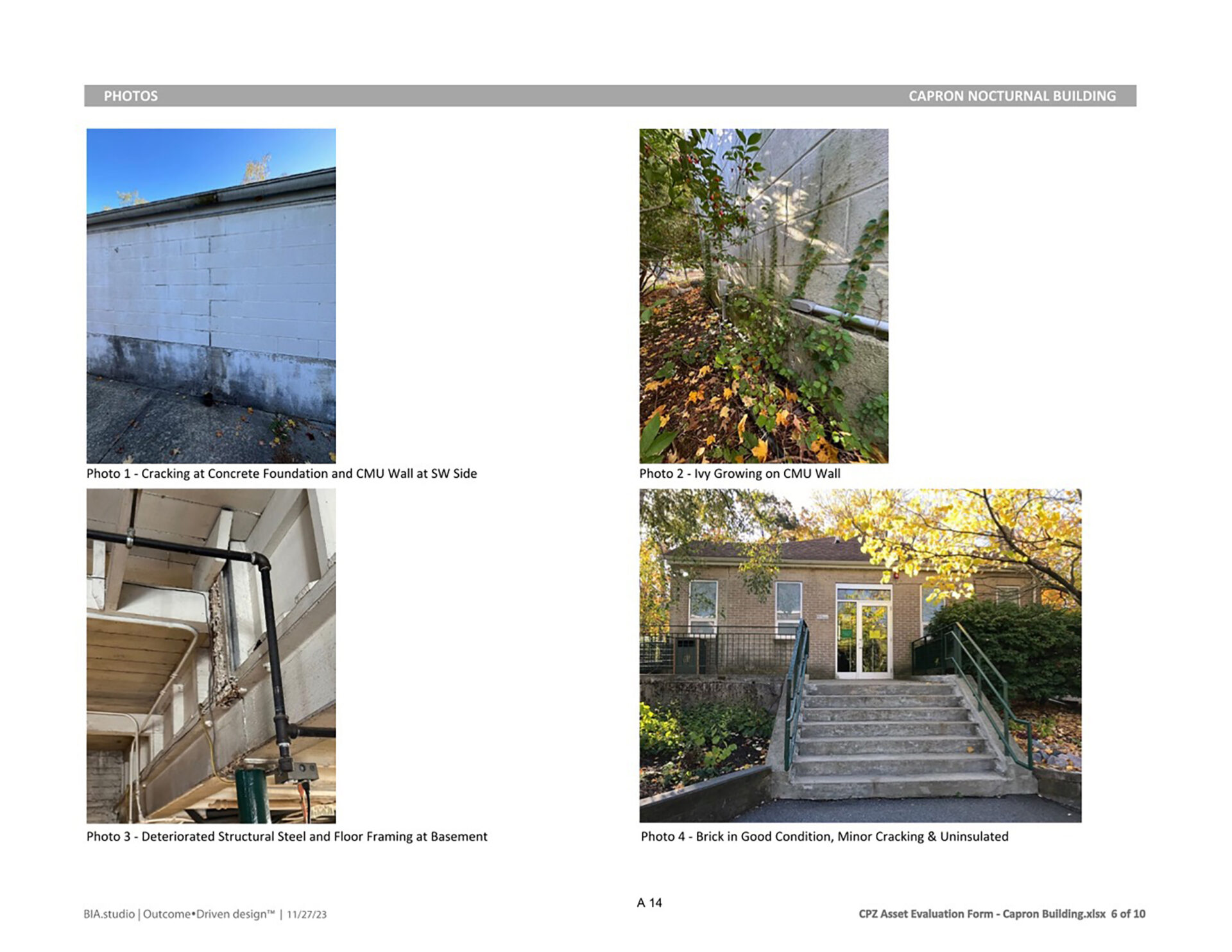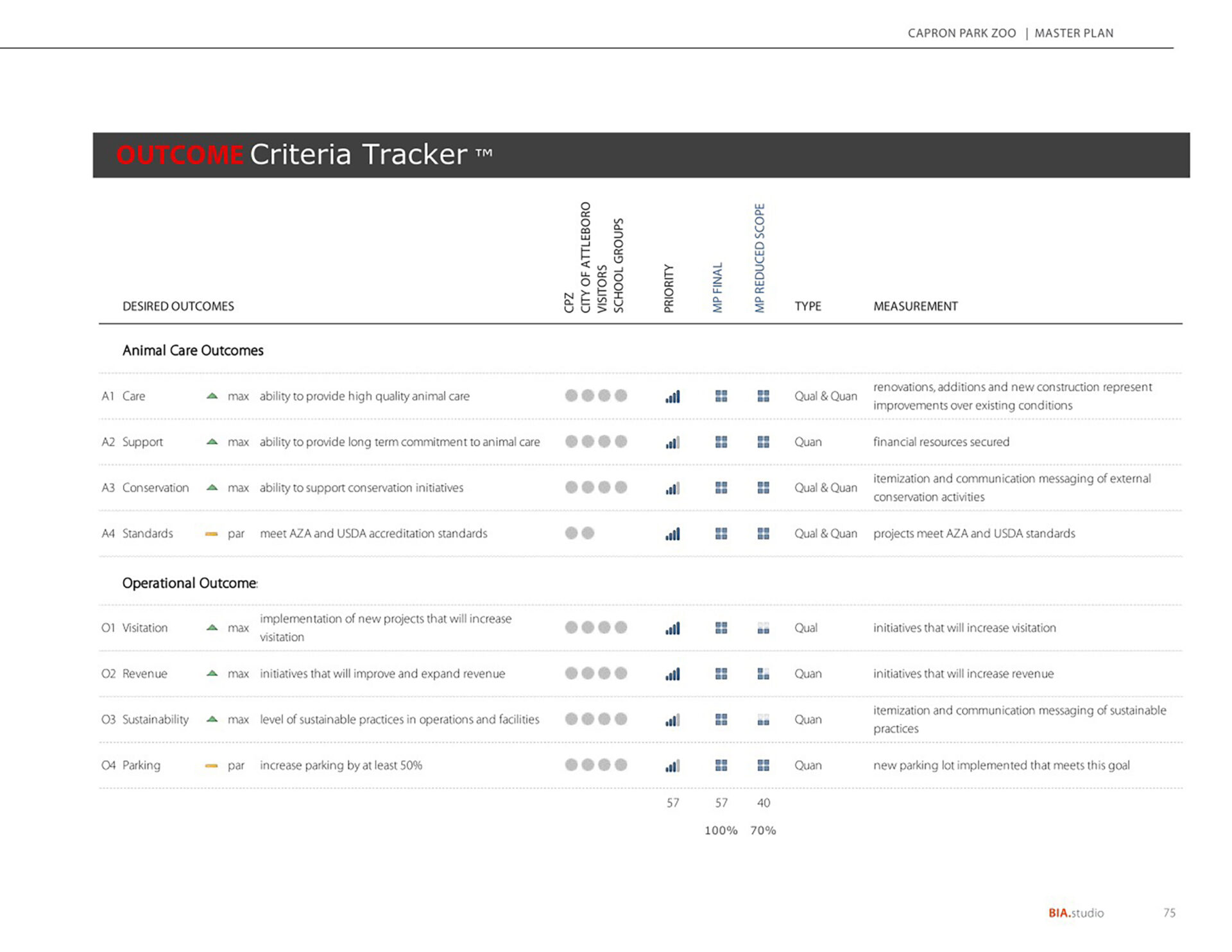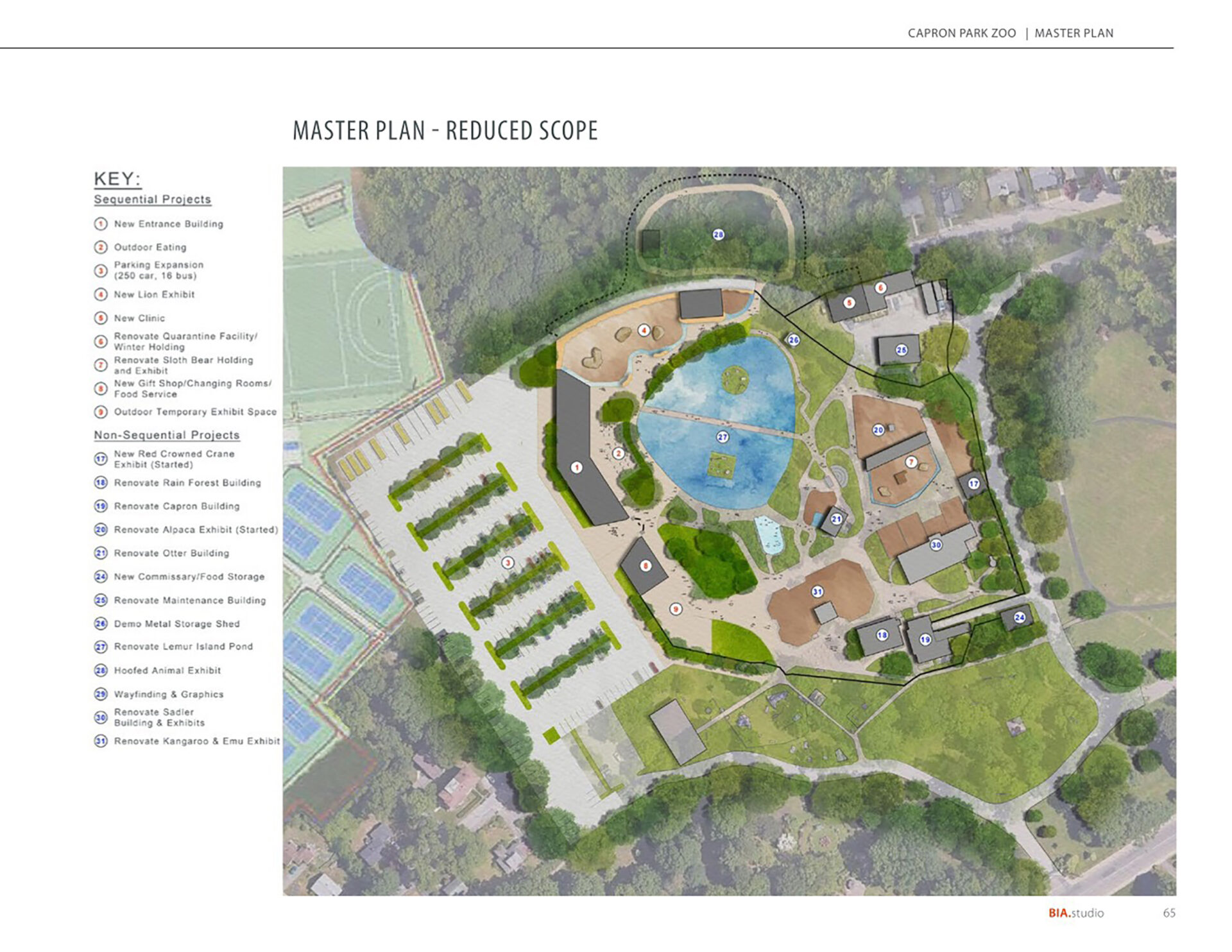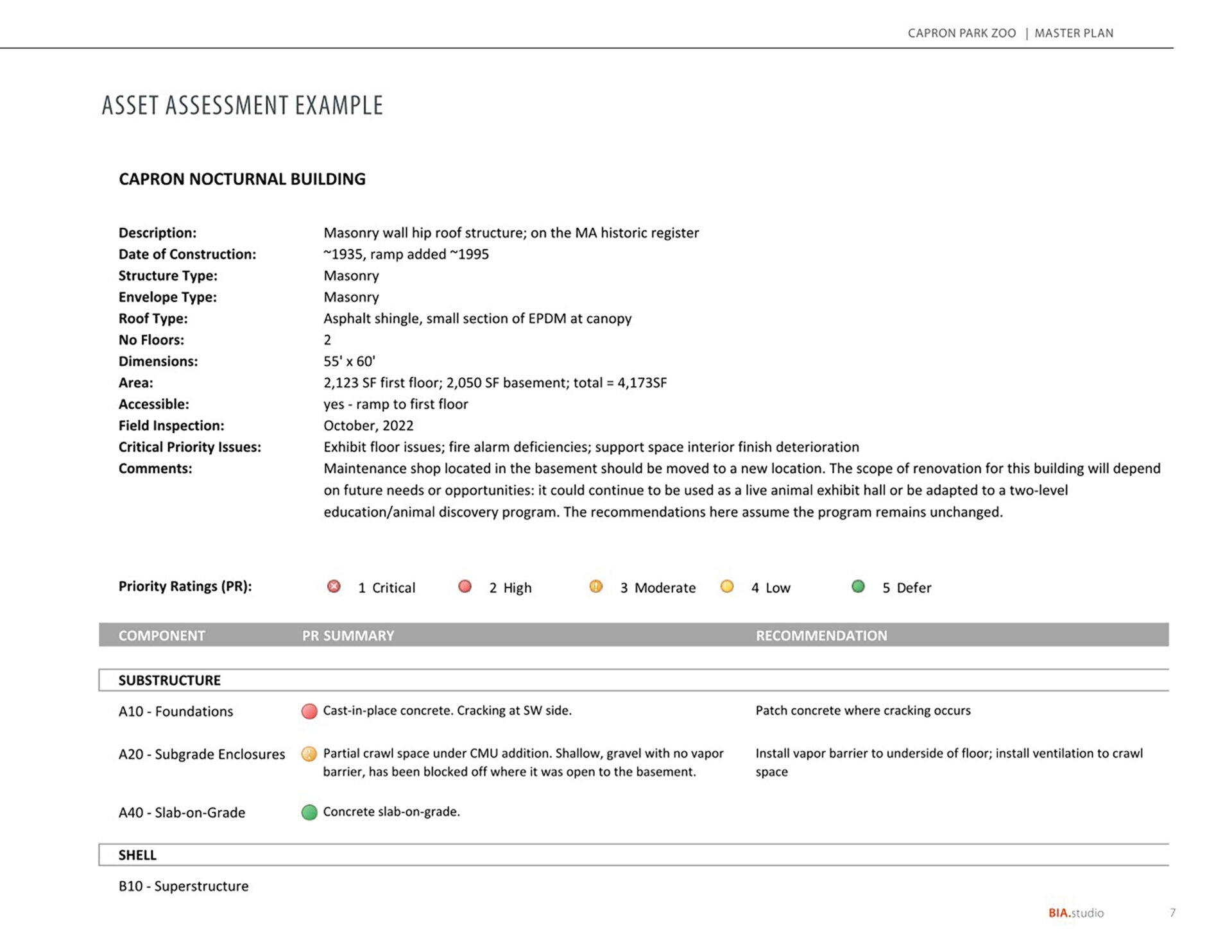 BIA.studio conducted a survey of existing facilities at the Capron Park Zoo, encompassing 8 acres, 8 buildings, and 10 outdoor exhibits. BIA.studio and its engineering team conducted walkthroughs of the site and facilities, and documented existing conditions, recommendations and priority ratings in Asset Assessment reports. Using our Outcome-Drive design methodology, BIA.studio met with stakeholders and distilled the Zoo’s long list of criteria, goals and objectives into a consolidated list of the outcomes viewed by the Zoo as essential to success.