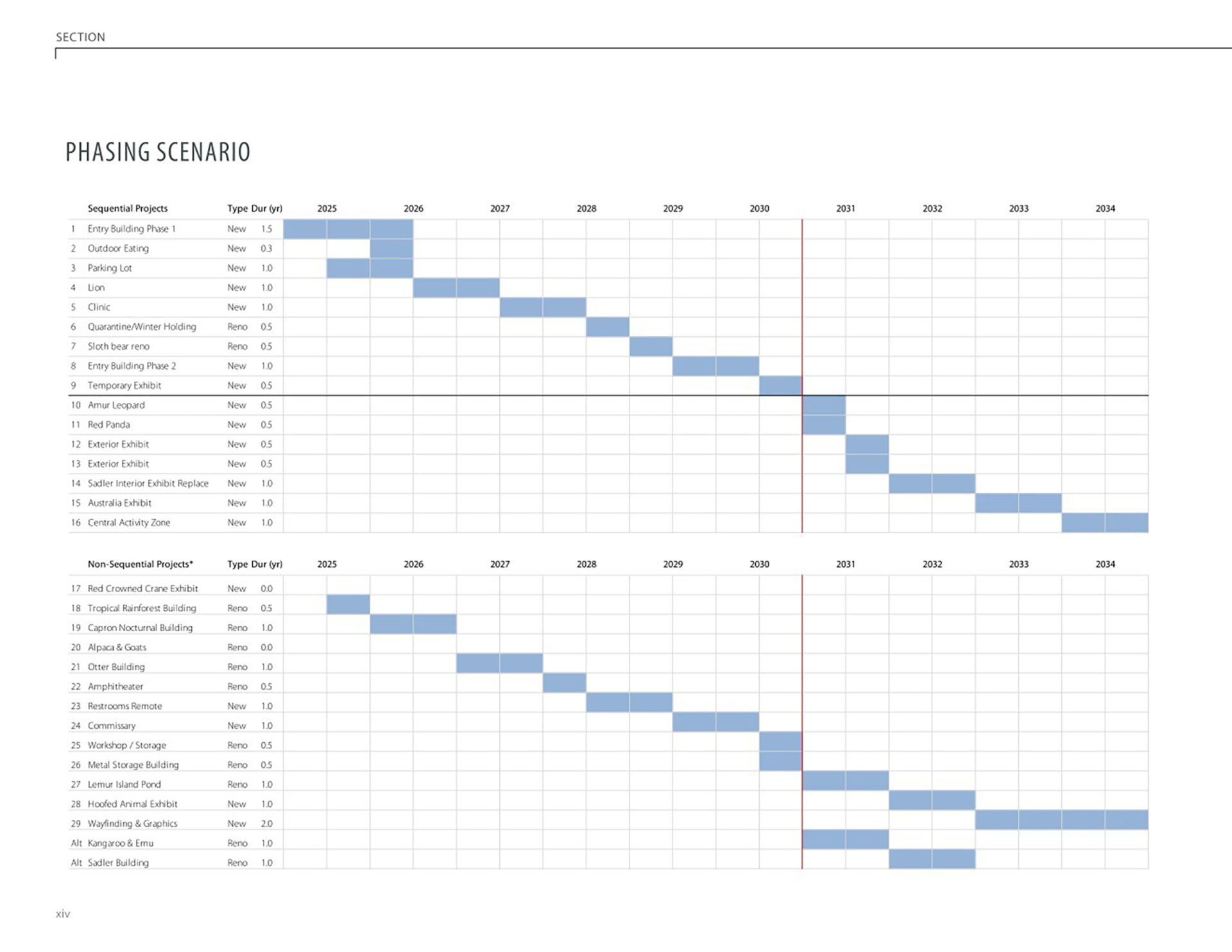 Based on the Asset Assessments and the criteria and priorities summarized in the Outcome Criteria Tracker, BIA.studio developed a conceptual framework of new facilities and renovation of existing assets. The full master plan envisions 16 sequential projects, where program elements are replaced with new facilities prior to removal or renovation of existing, and 13 non-sequential projects that can be undertaken at any time. A reduced master plan scope allows the Capron Park Zoo to undertake fewer new projects, reducing capital costs, while still serving as a roadmap for the future development of the zoo. In both versions a new entrance building and lion exhibit are the first and highest priority, replacing badly deteriorated facilities, and providing new amenities, with educational space, food service and event space, and an exciting new entrance exhibit. The new zoo site plan organizes all of the new and existing exhibits around a loop circuit visitor path, with a new central activity zone to complement the live animal experience with spaces that encourage play and discovery. All elements of the new master plan work to support the Zoo’s mission to “excite an interest in the natural world through education, conservation and recreation.”