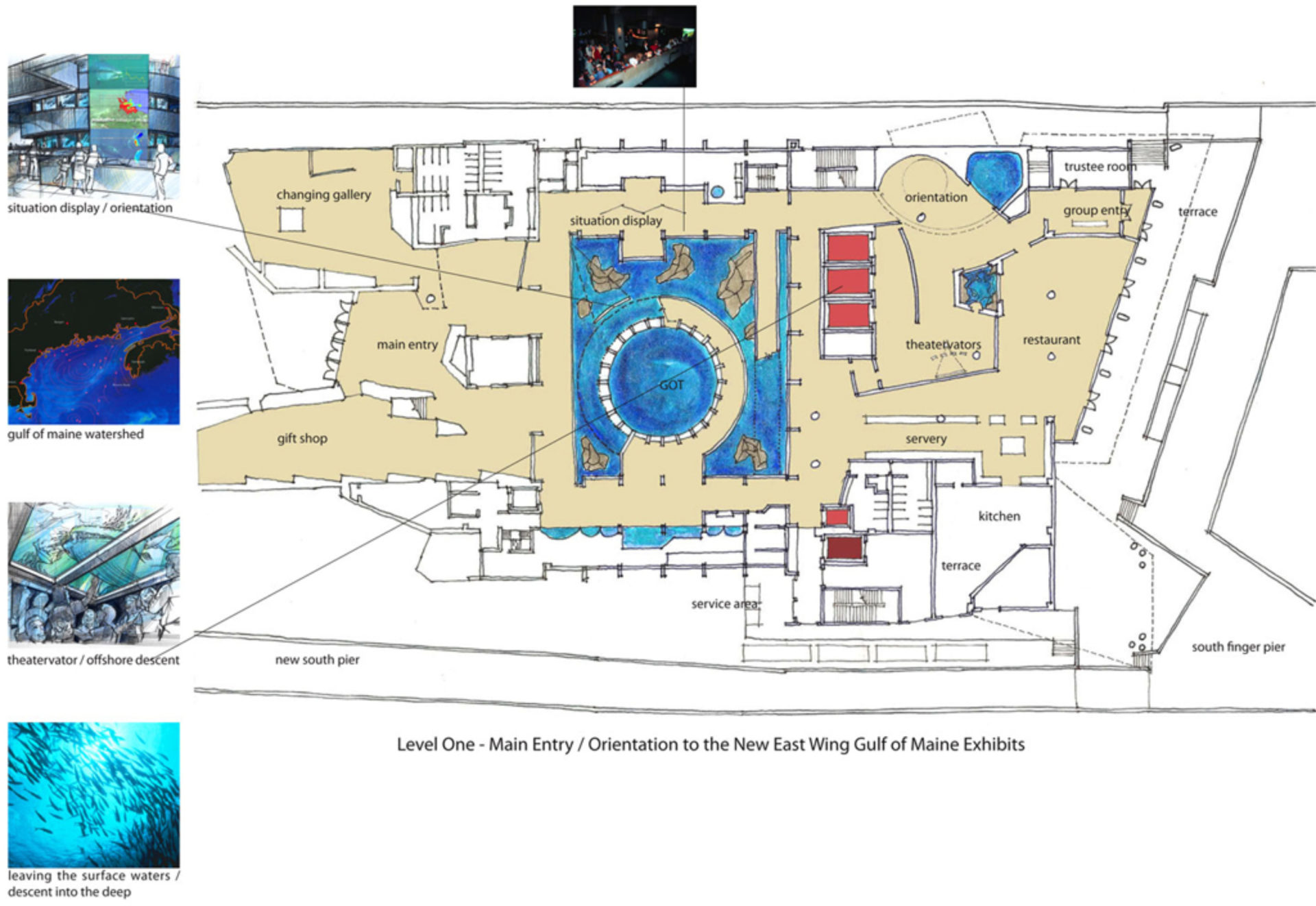 A new 89,000-square-foot, multi-level expansion of the New England Aquarium to more than double its current size. Located on the eastern, seaward end of the wharf, it will house major new permanent exhibits, as well as expanded dining and retail areas. The new exhibits will focus on New England coastal waters, integrating live animal exhibits with interactive and media technologies to create exciting, immersive experiences.