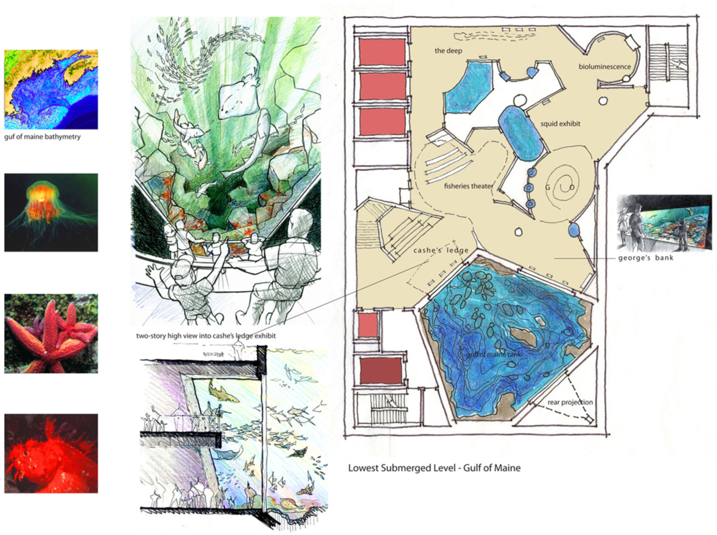 The expanded facility features two major signature exhibits: a 550,000-gallon, two-level high Gulf of Maine tank and an Eastern Rocky Shore exhibit displaying three different species of seals. The new East Wing will integrate seamlessly with the existing Aquarium and offer additional exhibits on the Gulf Stream, the deep, estuaries, salt marshes, and watershed ecosystems.