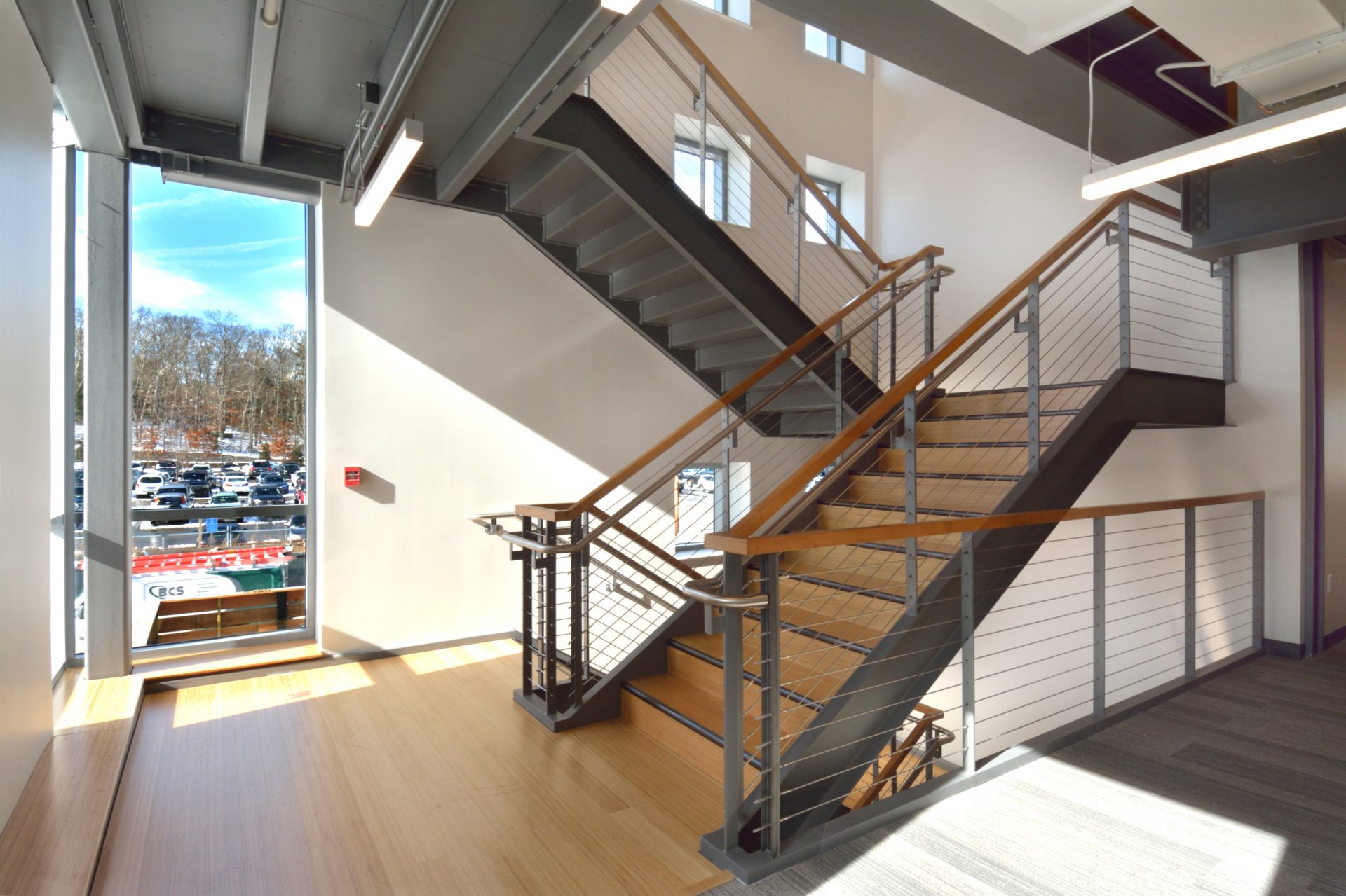 The office building is oriented with its narrow profile facing the street and is set behind an orchard that defines the Palmer Avenue street edge. Located on the site of a former wood frame barn, the new facility is comprised of two main sections: a smaller 2-story public barn facing Palmer Ave (approximately the same size as the original barn, and containing SSA’s public meeting and employee common spaces), and a larger 3-story working barn behind (housing SSA’s administrative, operations, engineering and technology staff). The two barns are linked by a 2-story glass enclosed lobby that serves as the building’s public entrance.