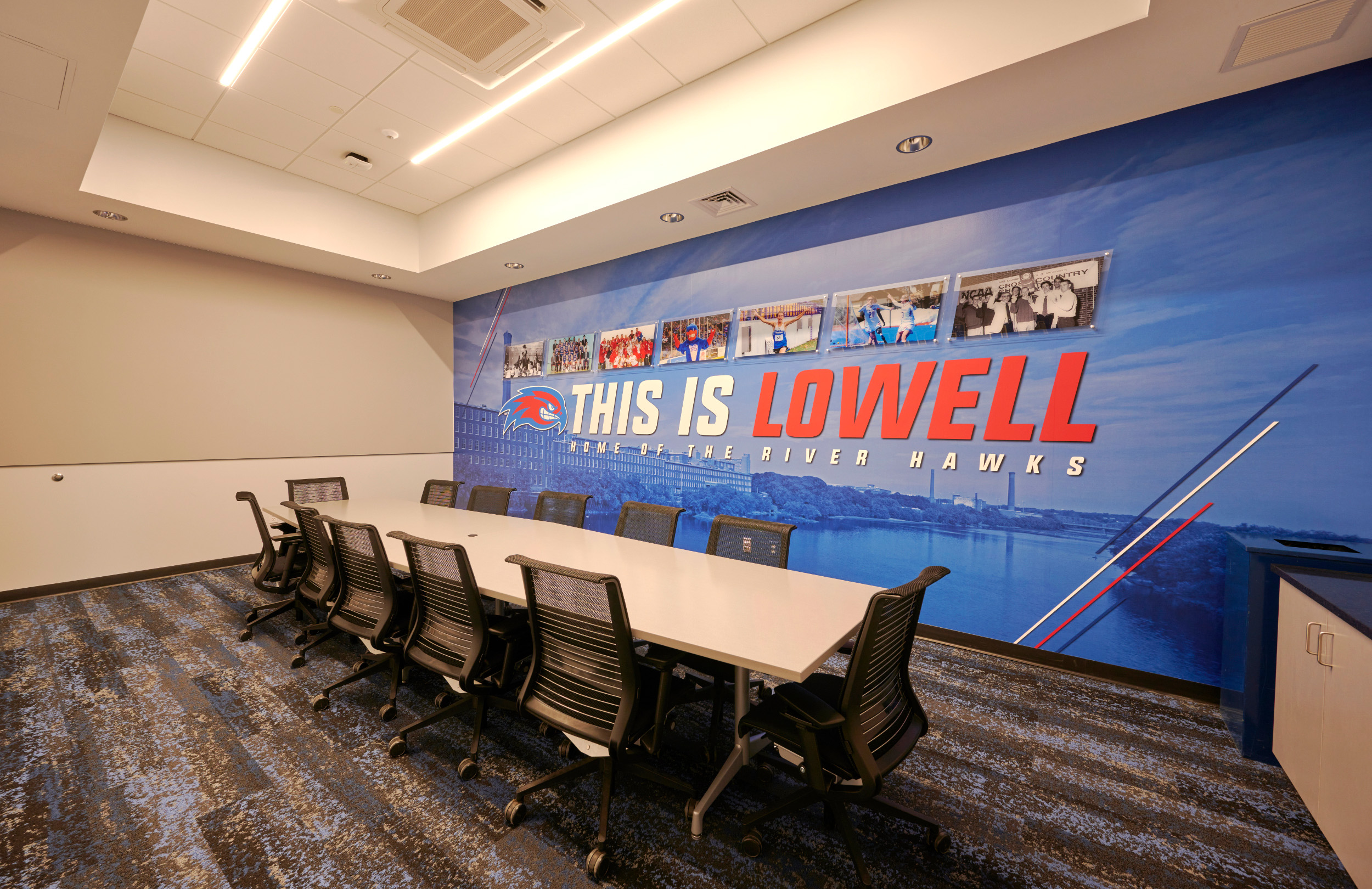 A new suite within the transformed double-height gymnasium at the Costello Athletic Center provides the UML Athletic Department with basketball team office suites, administrative office suites, a new film room with dedicated video review space with tiered seating for 55 and a new student athlete lounge. The central lounge takes advantage of the double-height gymnasium space, featuring natural light from the gymnasium’s clerestory windows. Renovated locker rooms provide updated shower facilities and new lockers for both the men’s and women’s basketball teams.