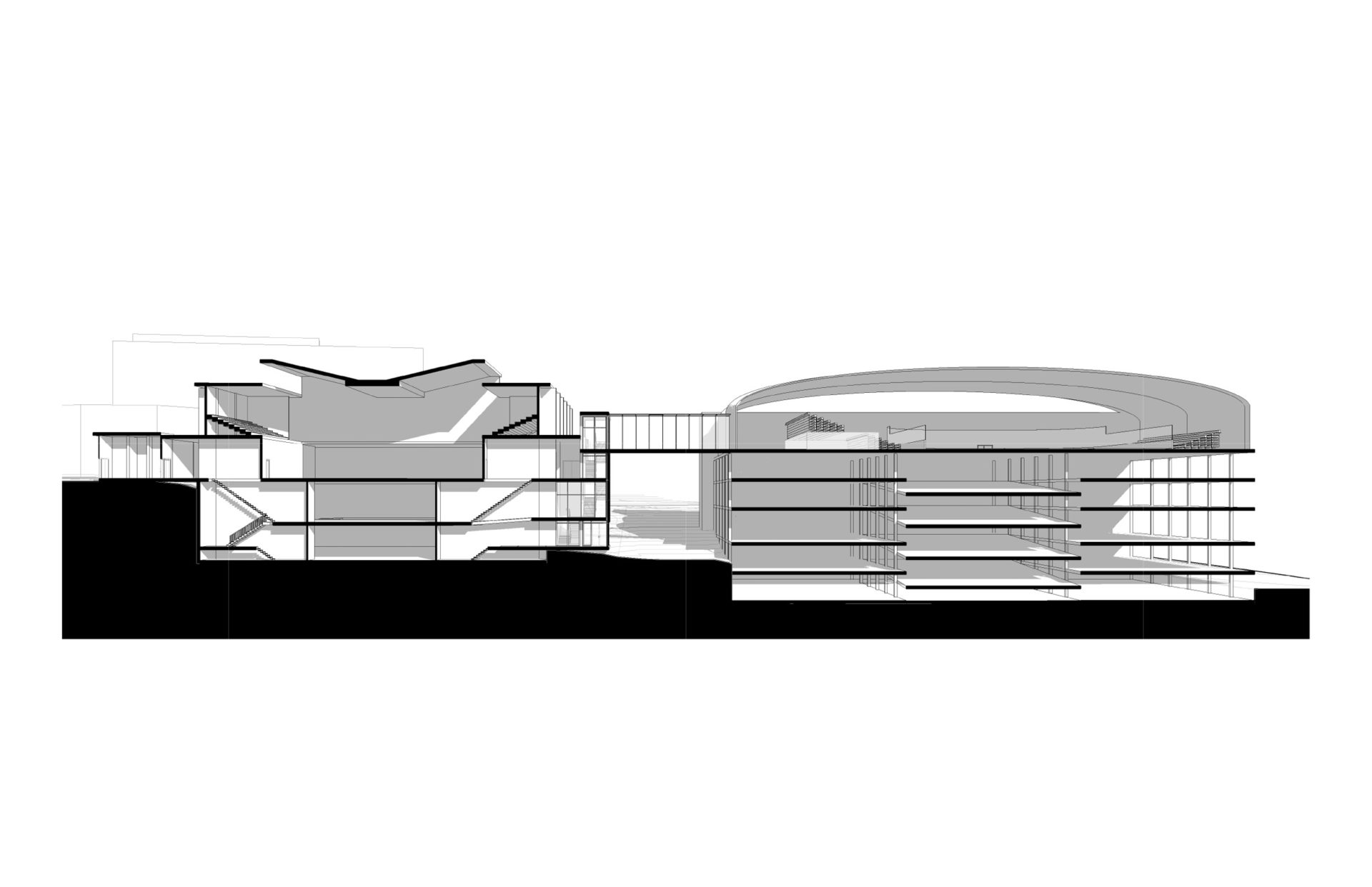 To provide UML with its own on-campus ice hockey arena, BIA.studio conducted a series of design studies to expand Costello Gym with a new multi-purpose sports space atop the 180’ x 500’ footprint of BIA’s 650-car parking structure to be sited immediately adjacent. Reached from Costello Gym by a transparent glass bridge at an upper level, and enclosed within a pressurized fabric structure, this new facility was designed to accommodate both a refrigerated hockey arena with bleacher seating, as well as a basketball venue and indoor track.